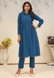 Blue Chinon Silk Readymade Pant Style Suit