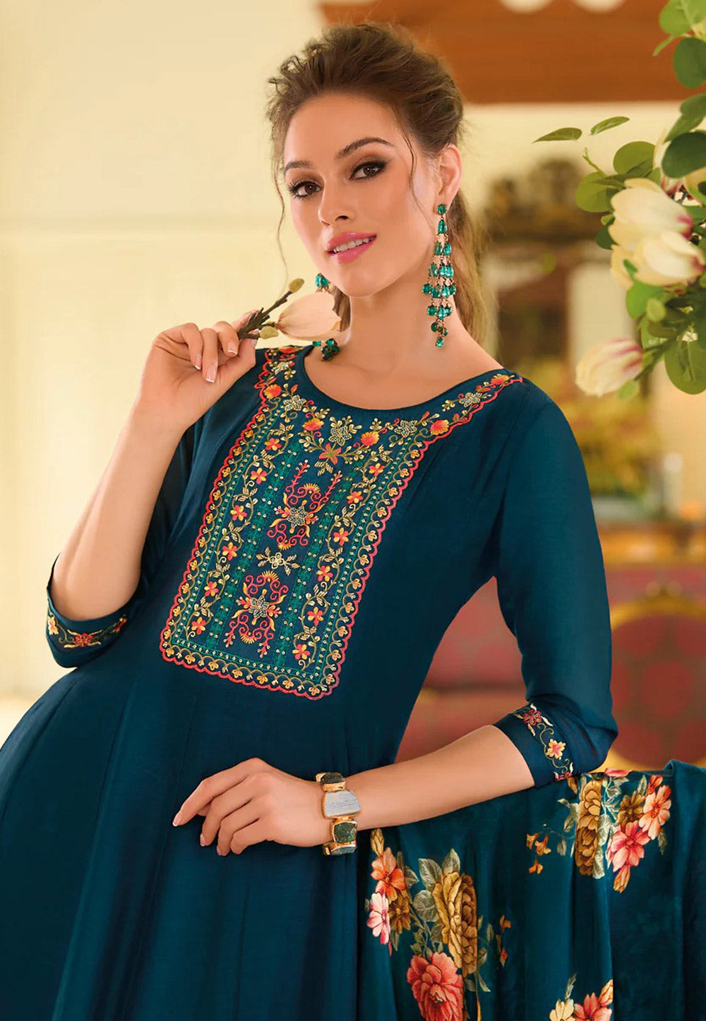 Teal Net Embroidered Long Anarkali Suit