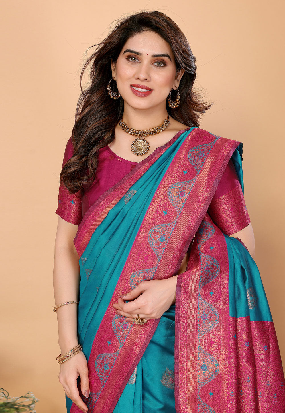 Teal Banarasi Silk Saree With Blouse