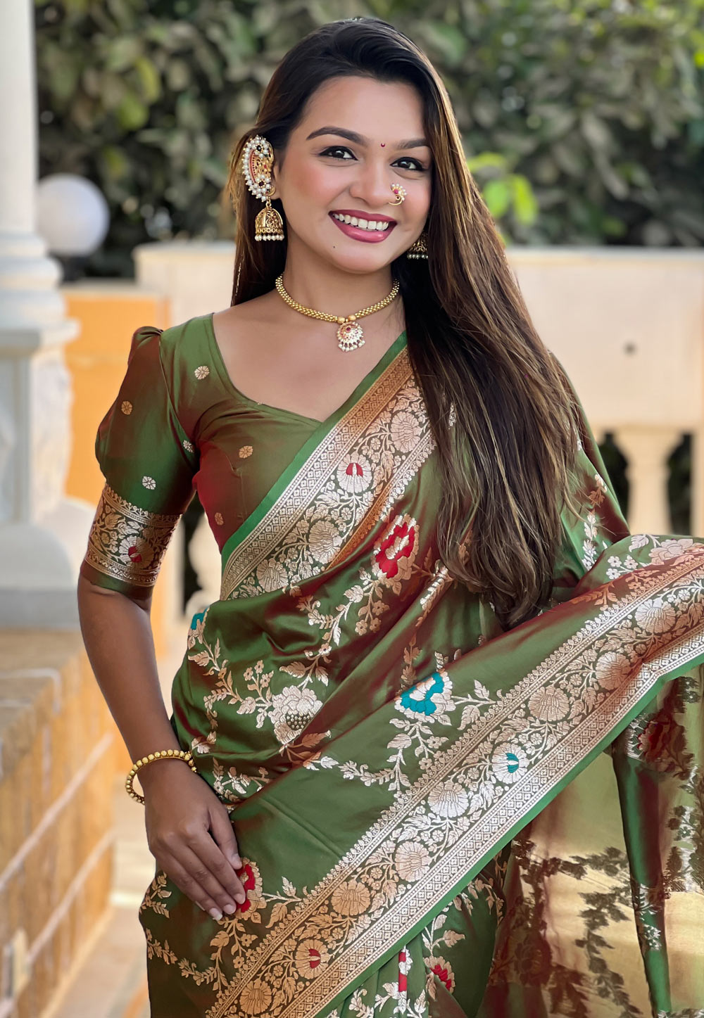 Green Banarasi Silk Saree With Blouse