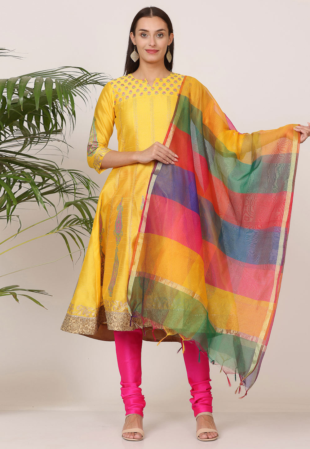 Yellow Silk Readymade Churidar Suit