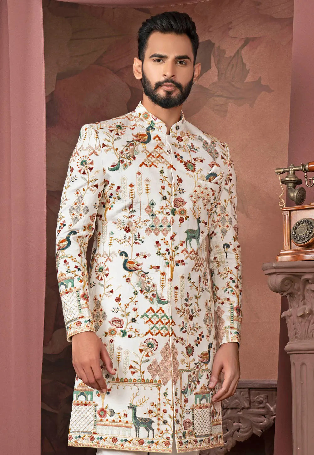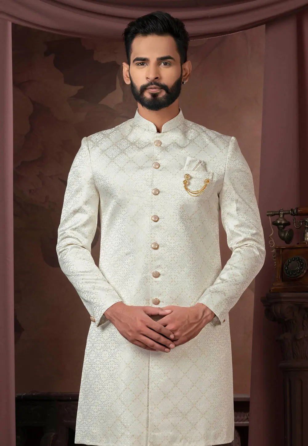 Cream Jacquard Silk Indo Western Sherwani
