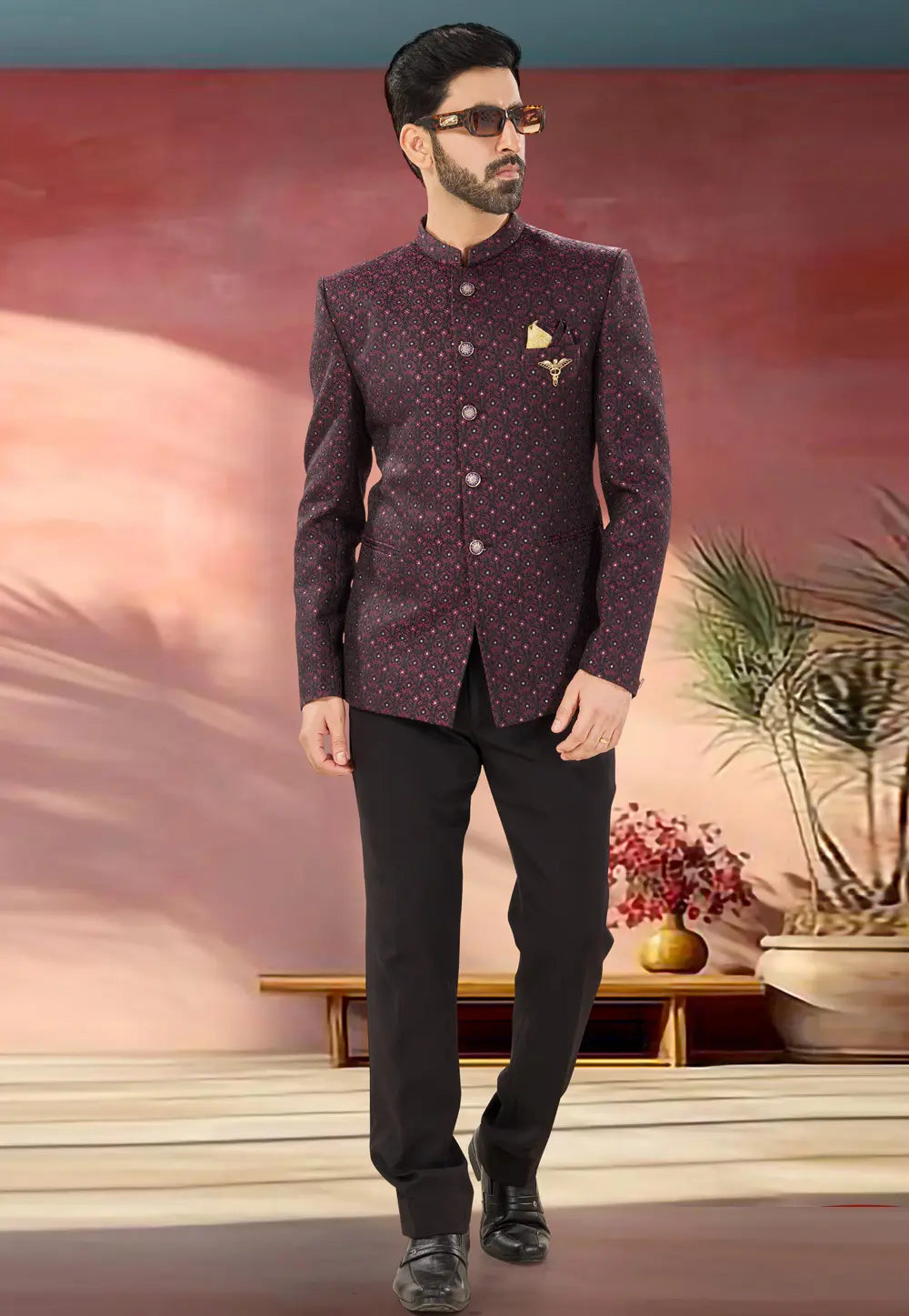 Maroon Jacquard Jodhpuri Suit