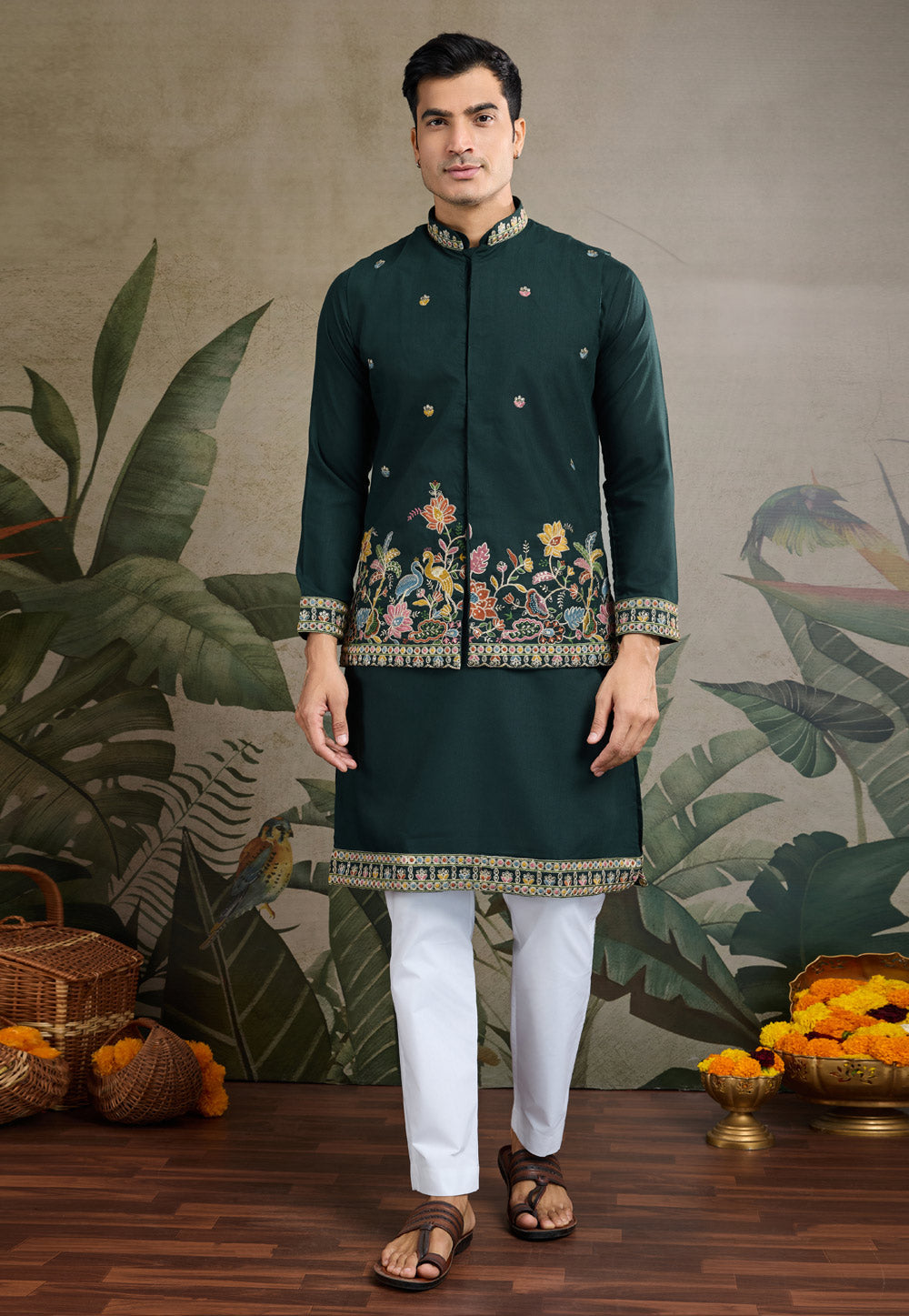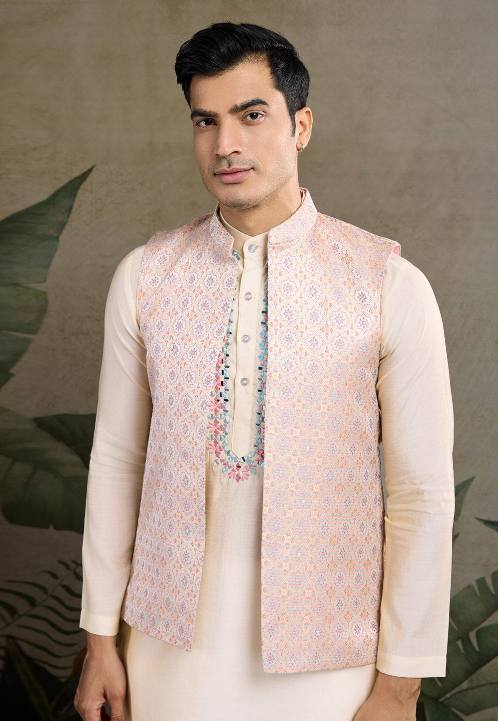 White Cotton Silk Peshwai Style Kurta Pajama With Jacket