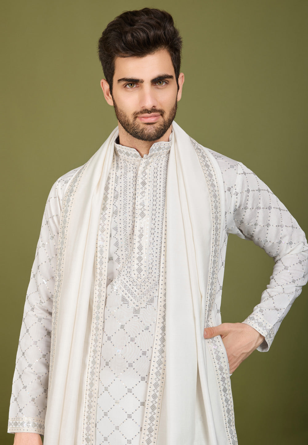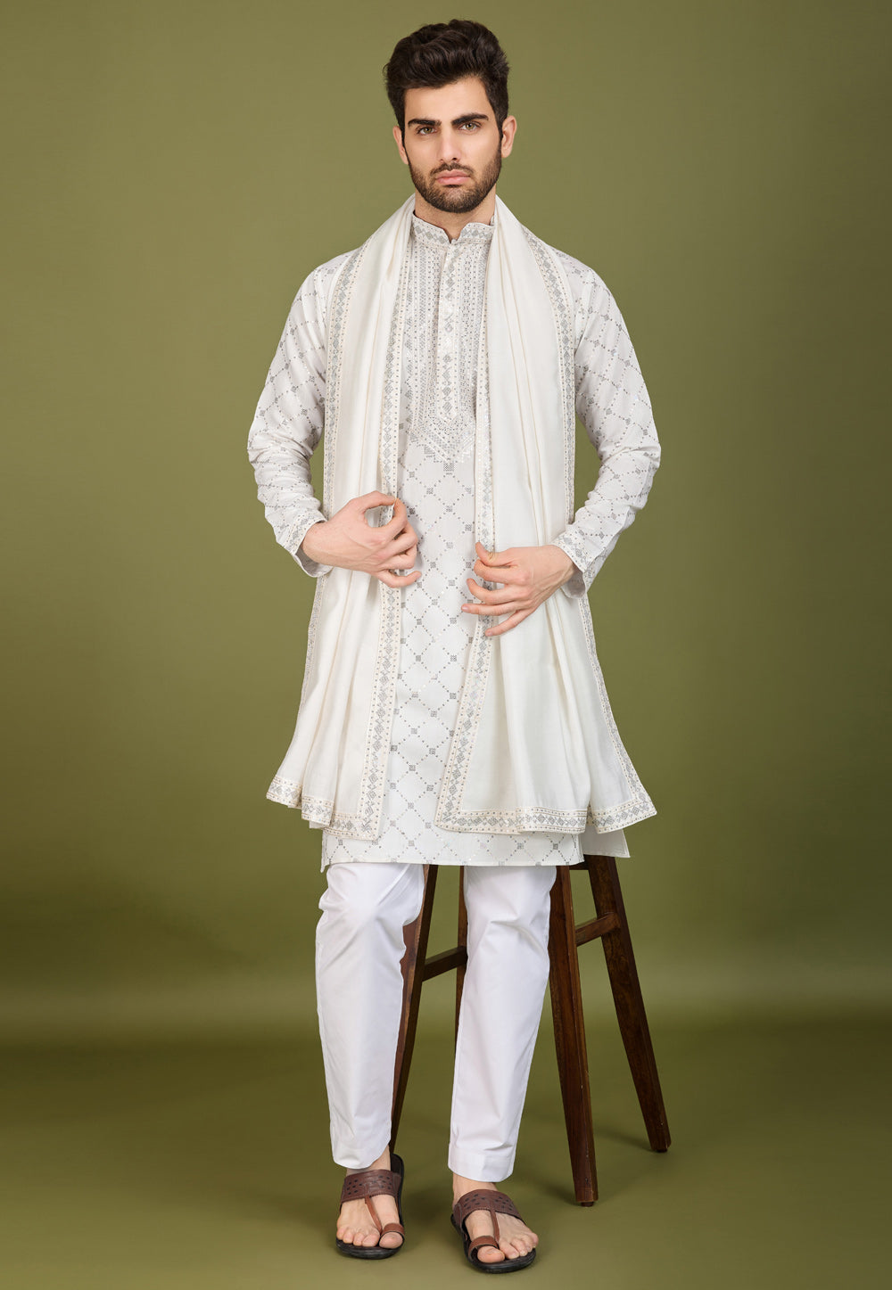 White Viscose Kurta Pajama With Stole