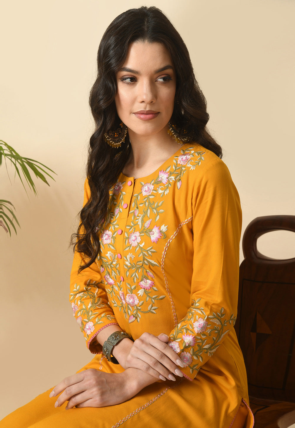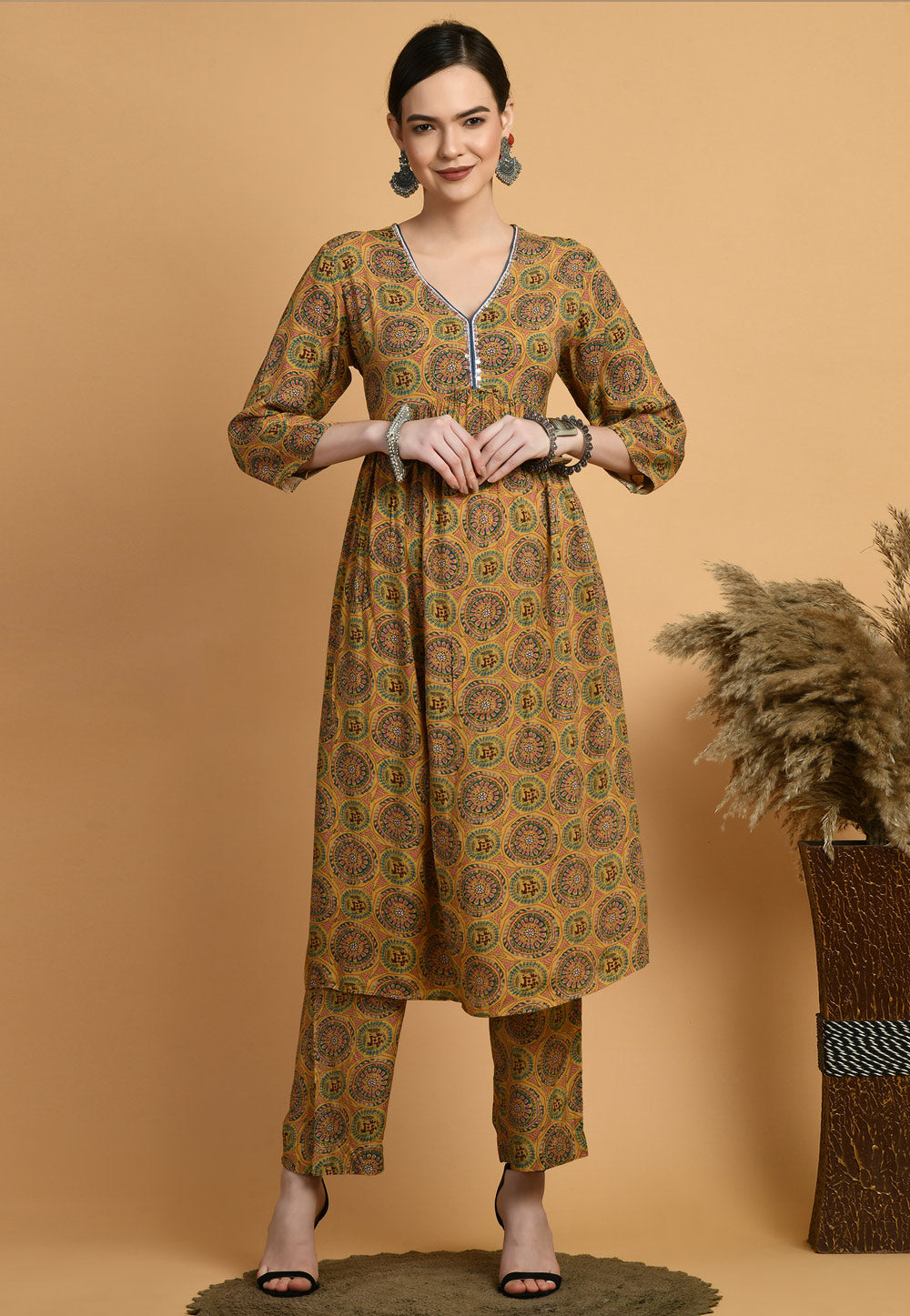 Mustard Cotton Rayon Kurta Set With Pent