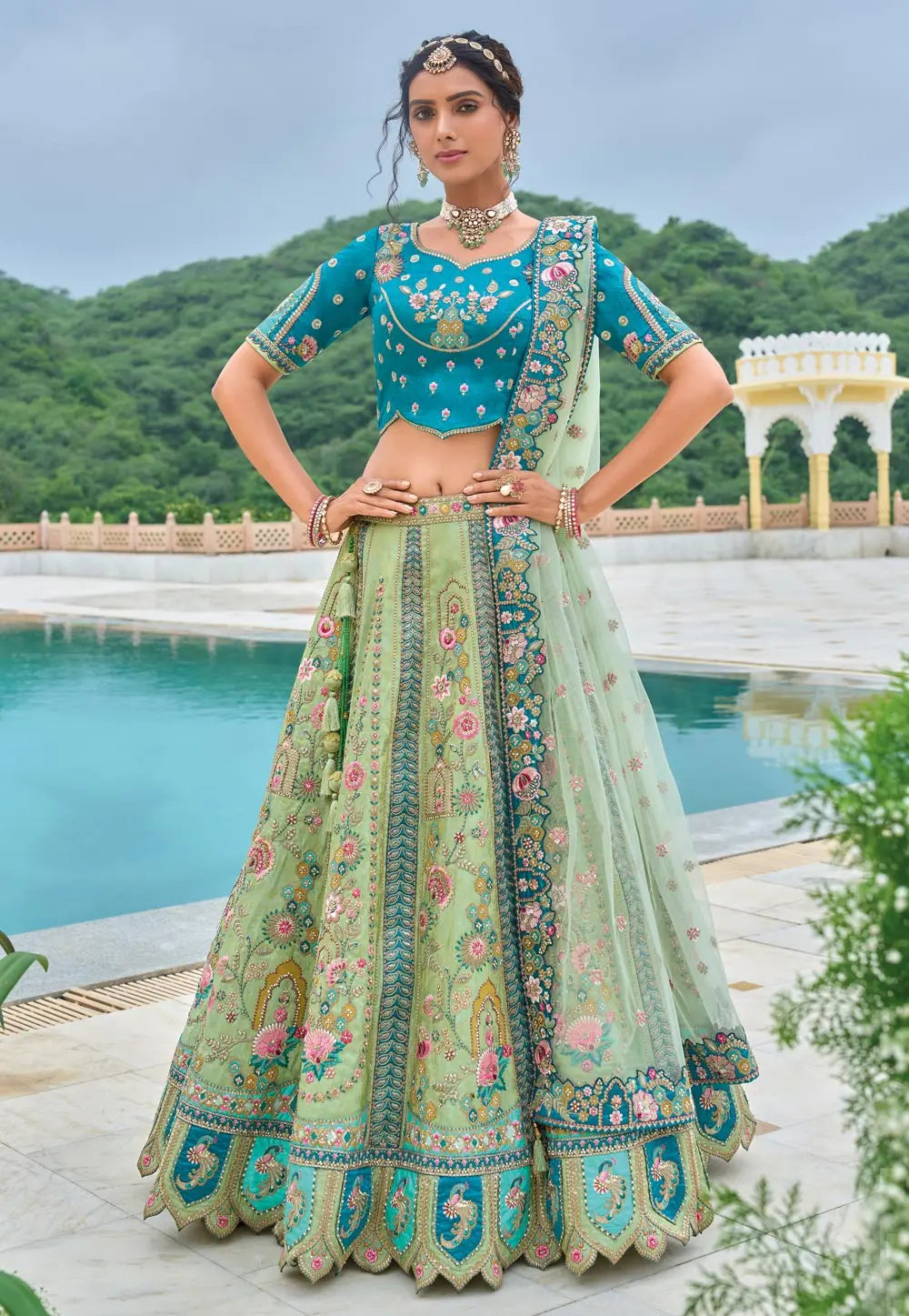 Pista Green Silk Net Lehenga Choli For Wedding