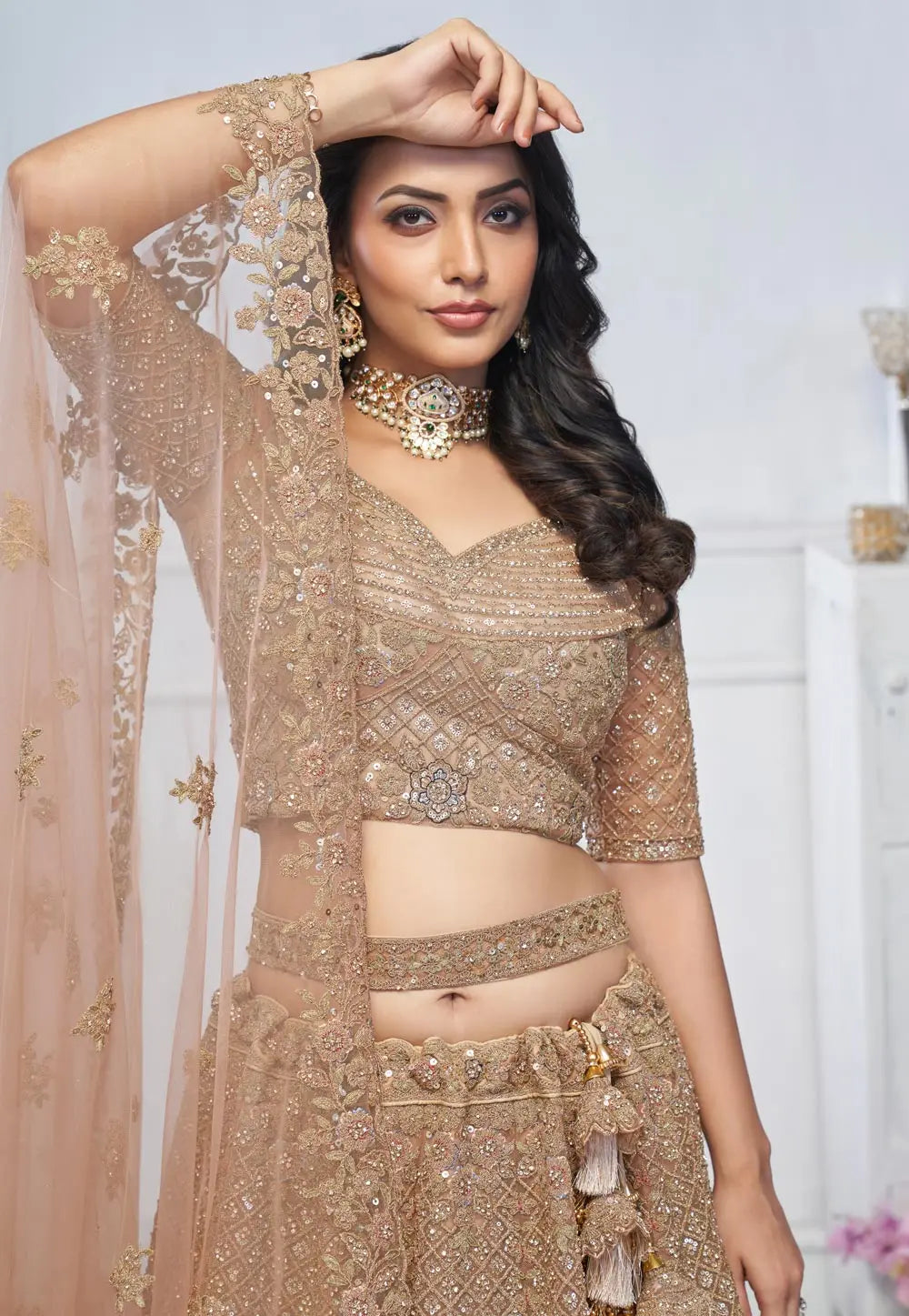 Peach Silk Net Wedding Lehenga Choli