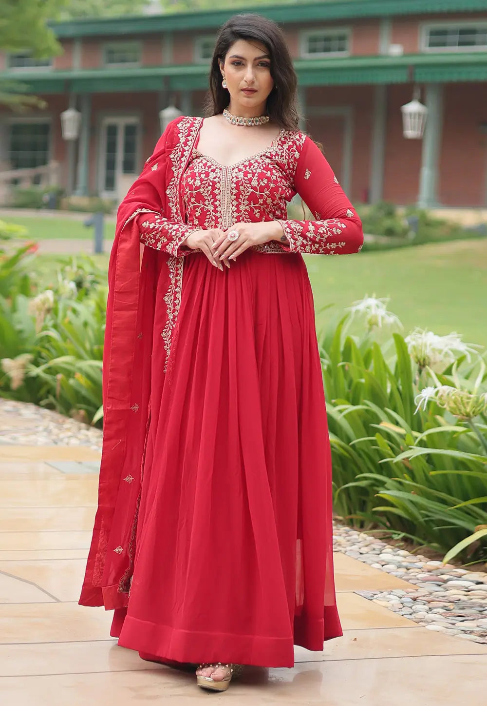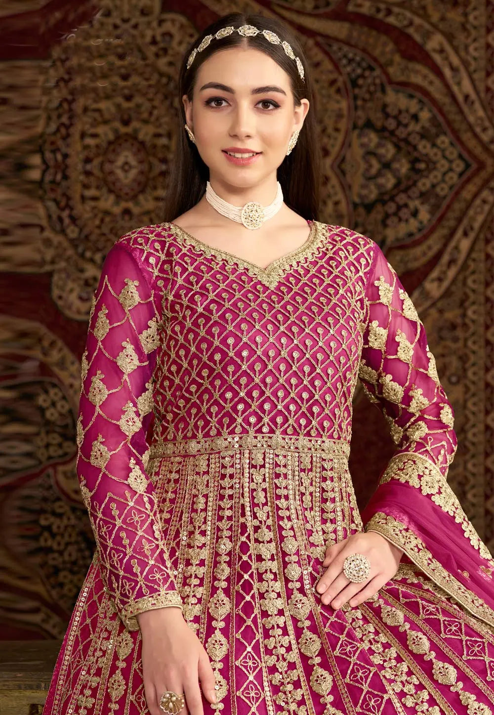 Pink Net Embroidered Readymade Long Anarkali Suit