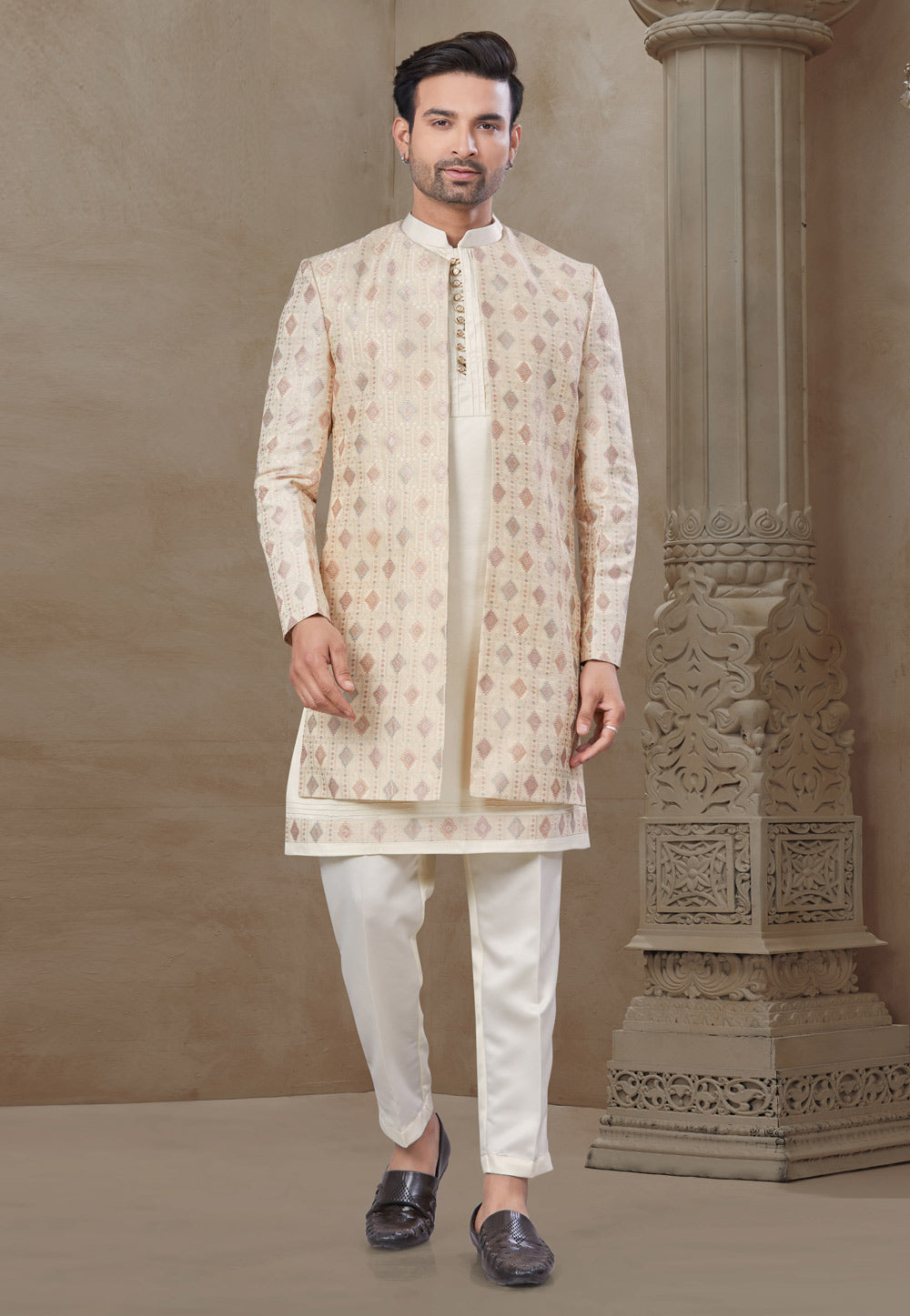 Beige Jacquard Indo Western Suit