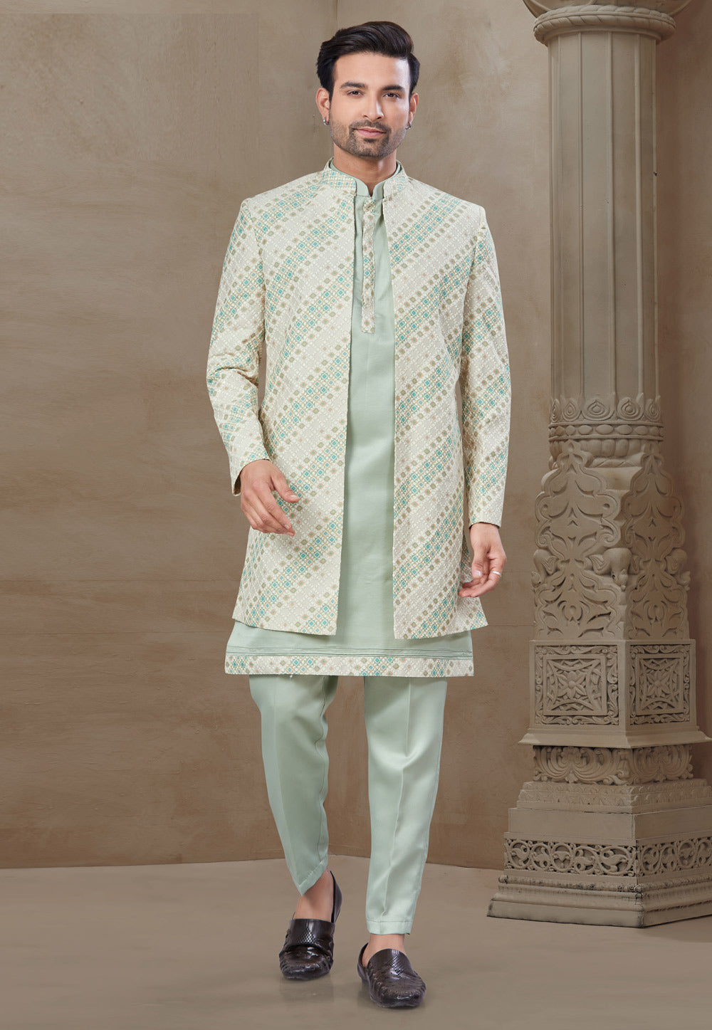 Pista Green Jacquard Indo Western Suit