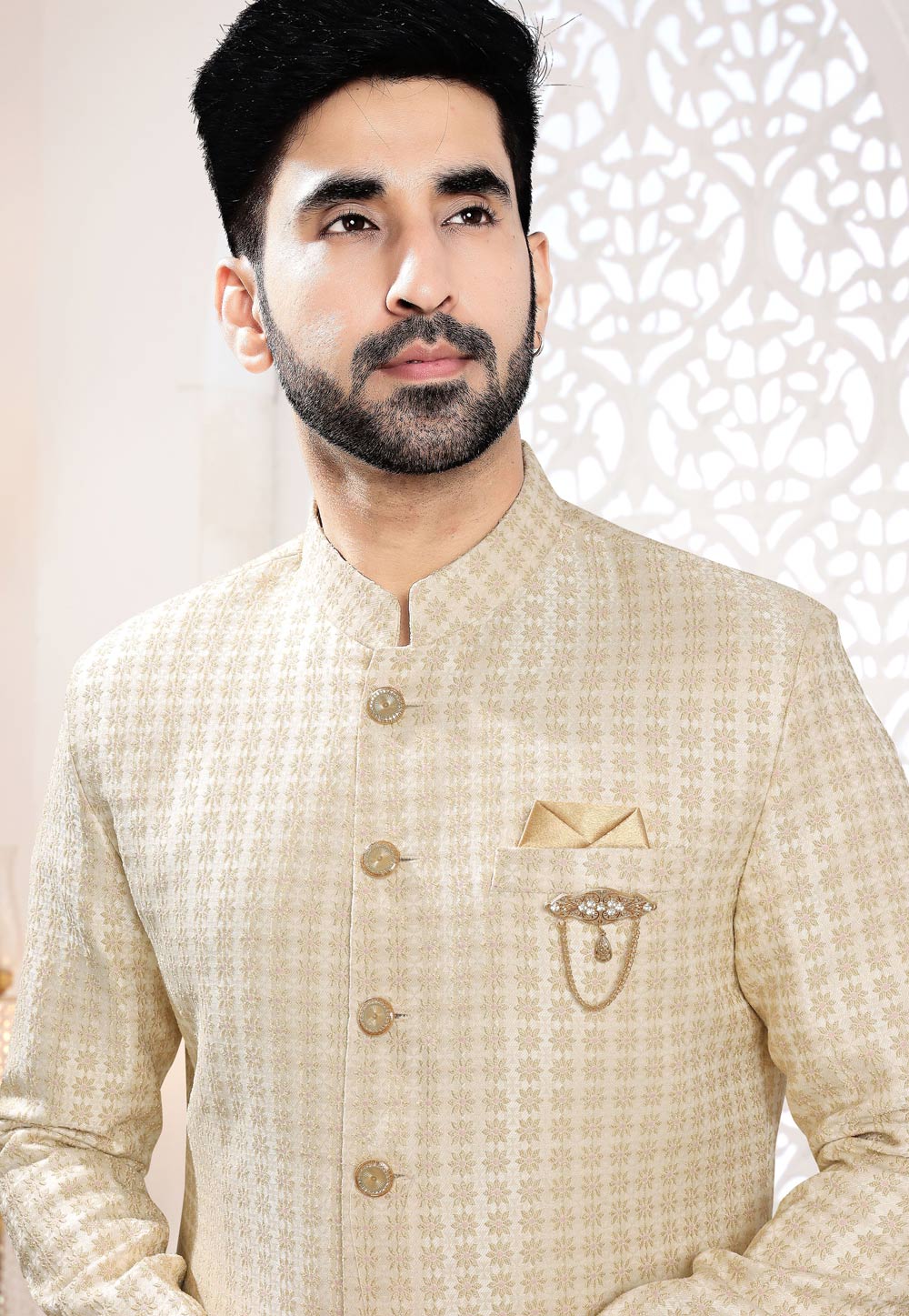 Beige Jacquard Indo Western Suit