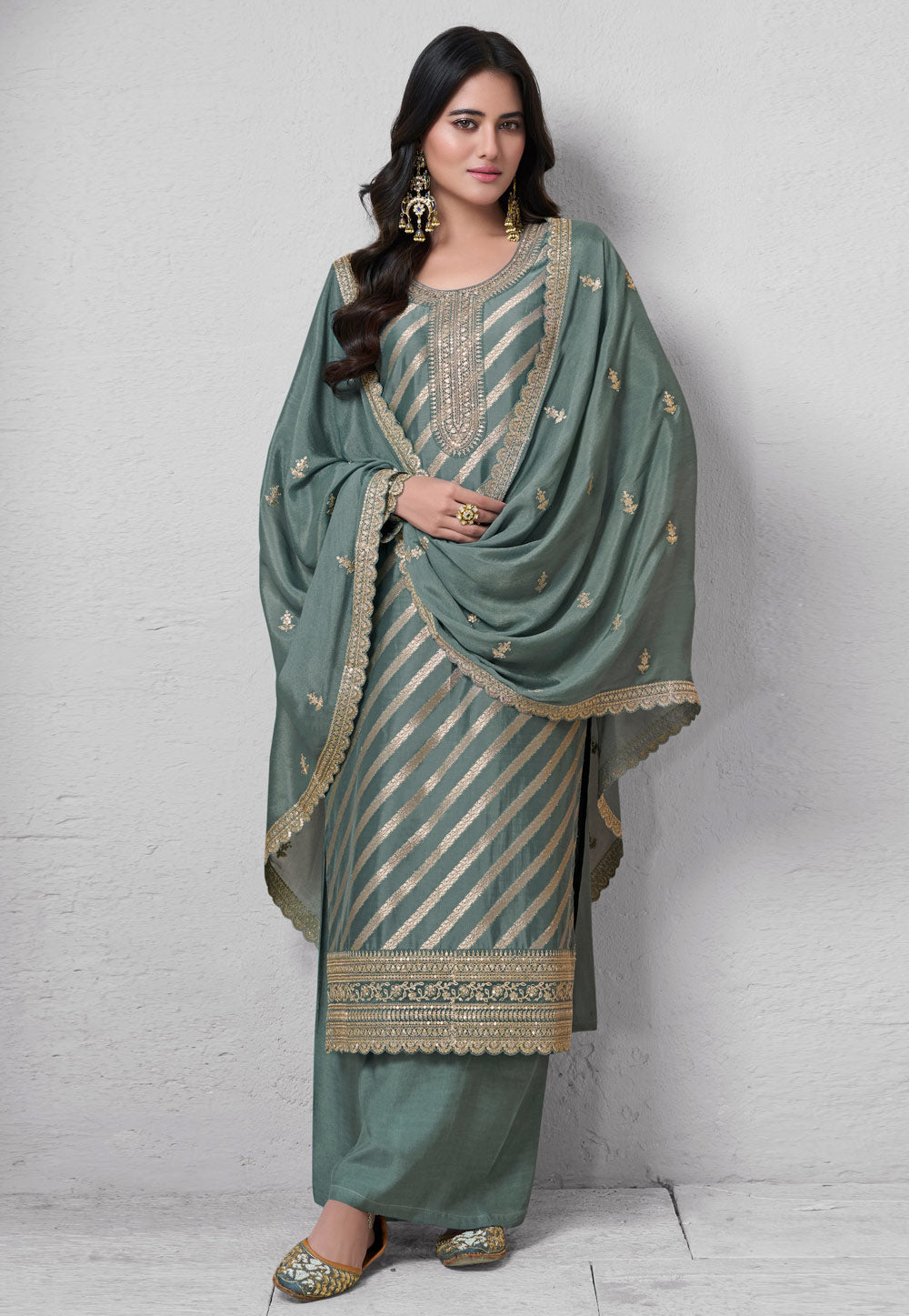 Pista Green Chanderi Silk Readymade Pant Style Suit