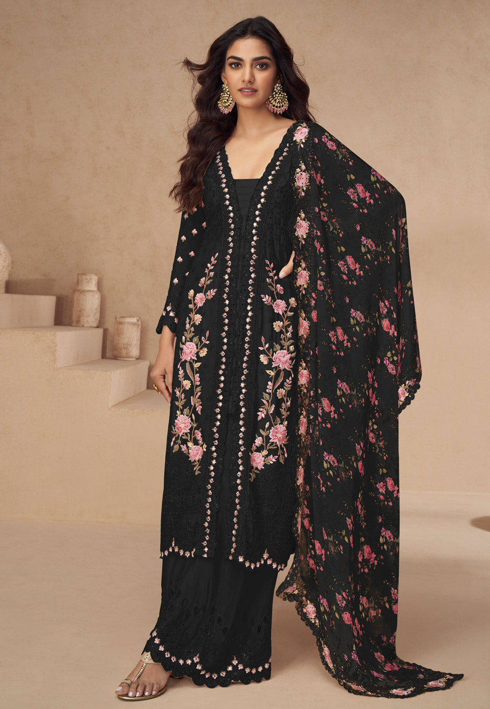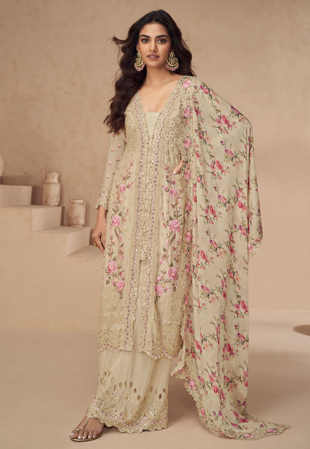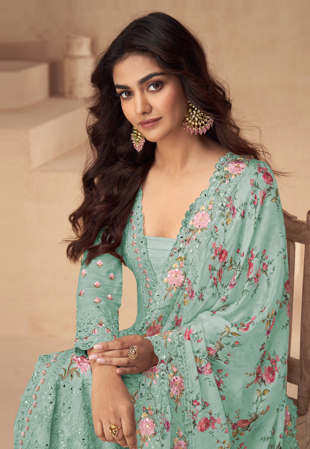 Sea Green Chinon Silk Embroidered Palazzo Suit