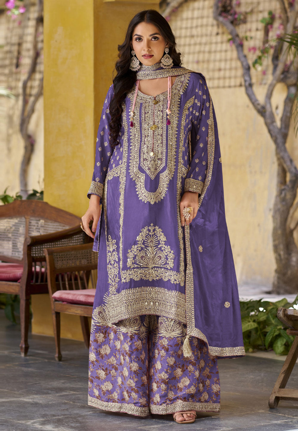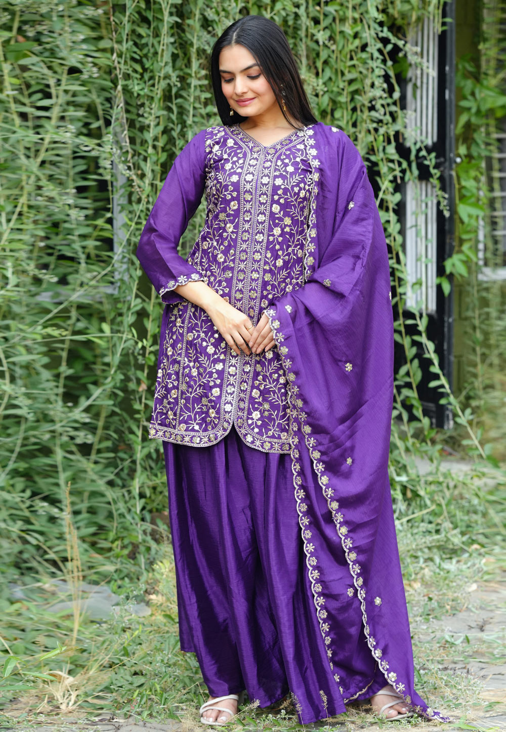 Purple Chinon Readymade Palazzo Suit