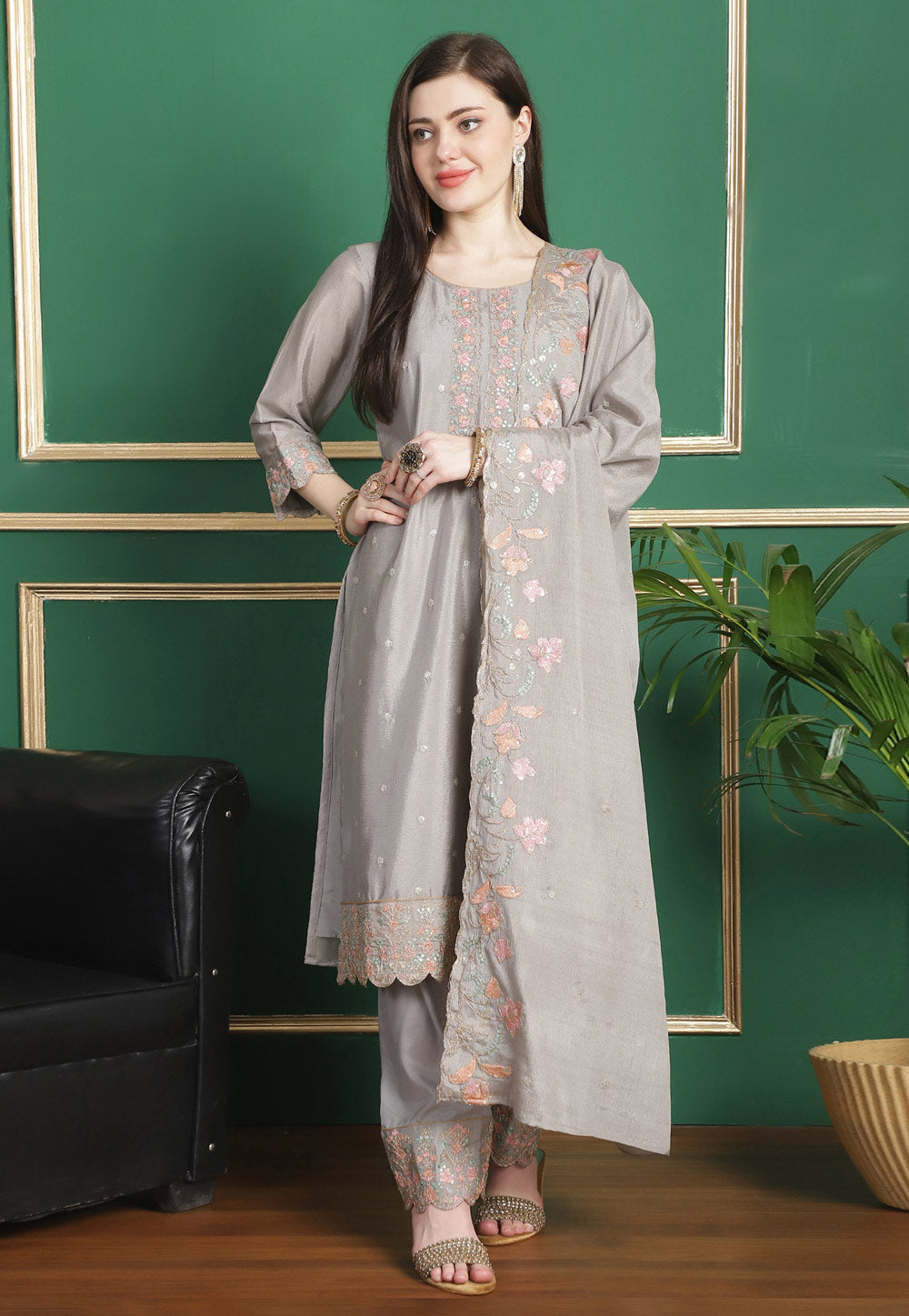 Grey Chinon Chiffon Pant Style Suit