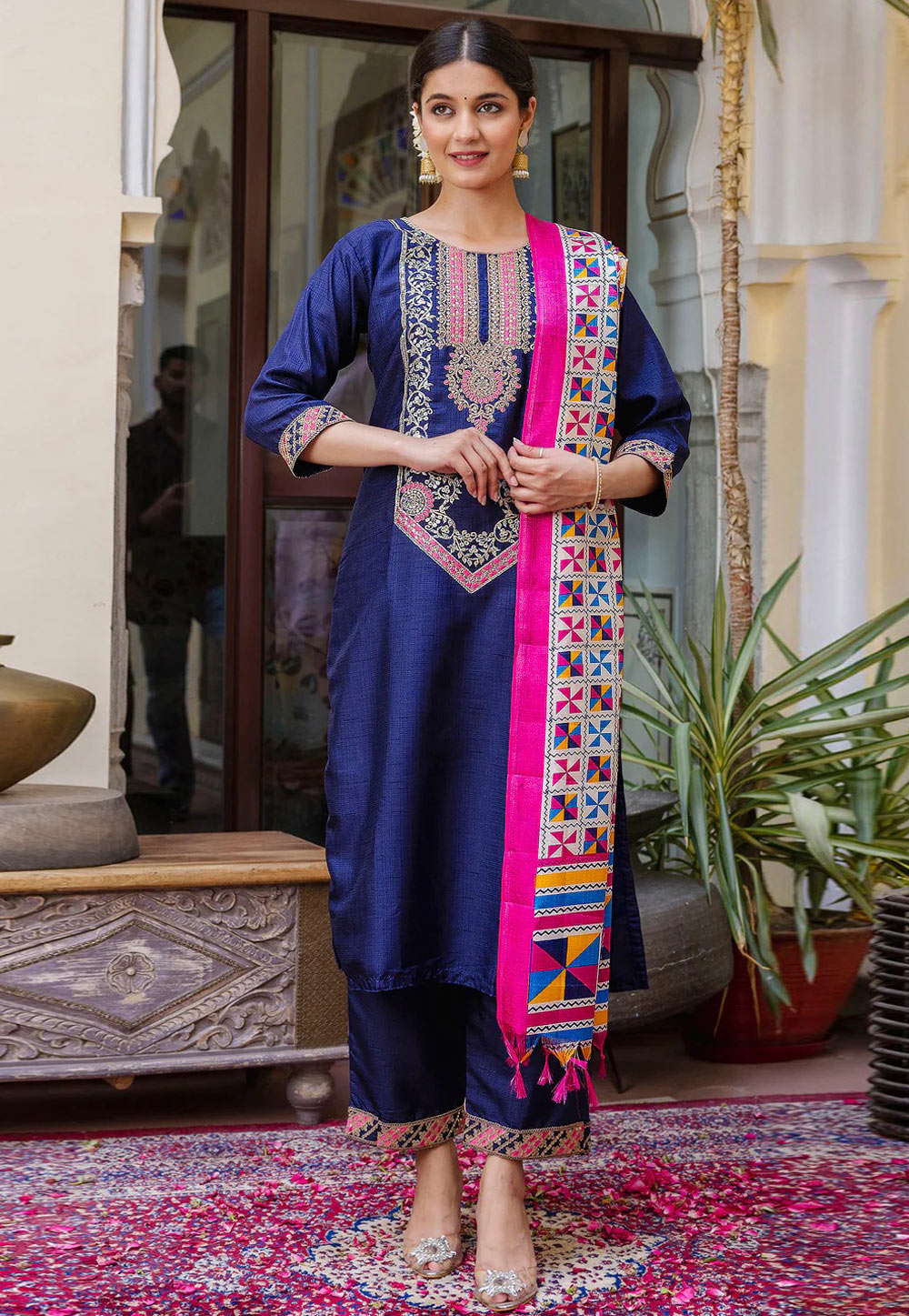 Navy Blue Silk Readymade Pant Style Suit