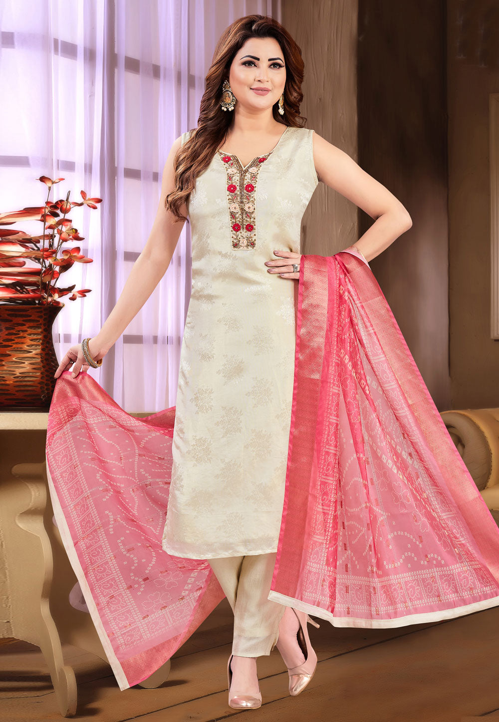 Off White Silk Readymade Pakistani Suit