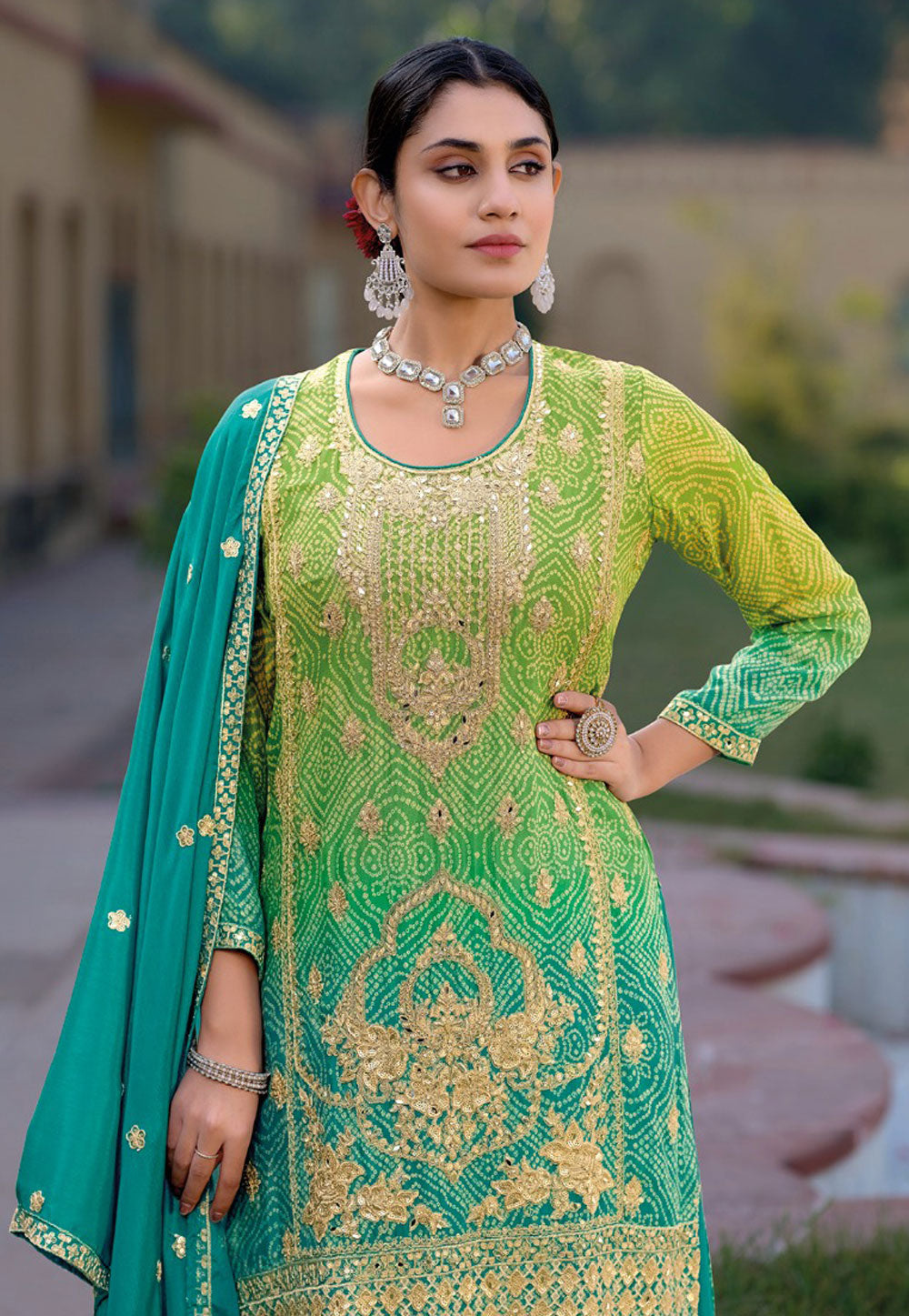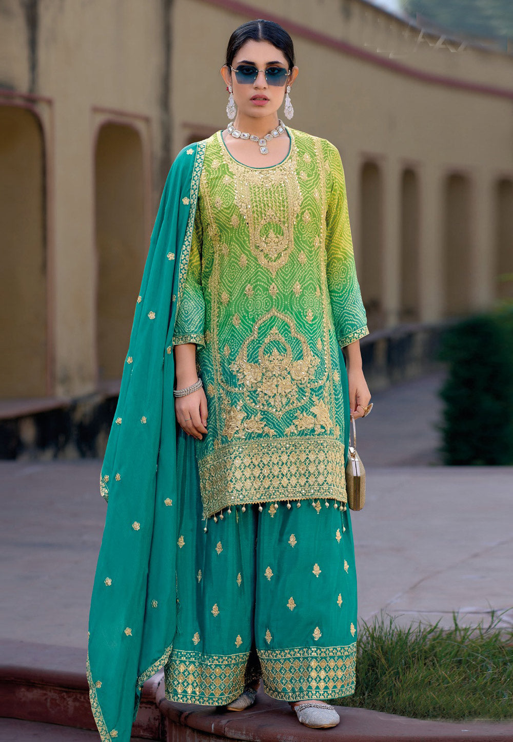 Teal Chinon Silk Palazzo Suit
