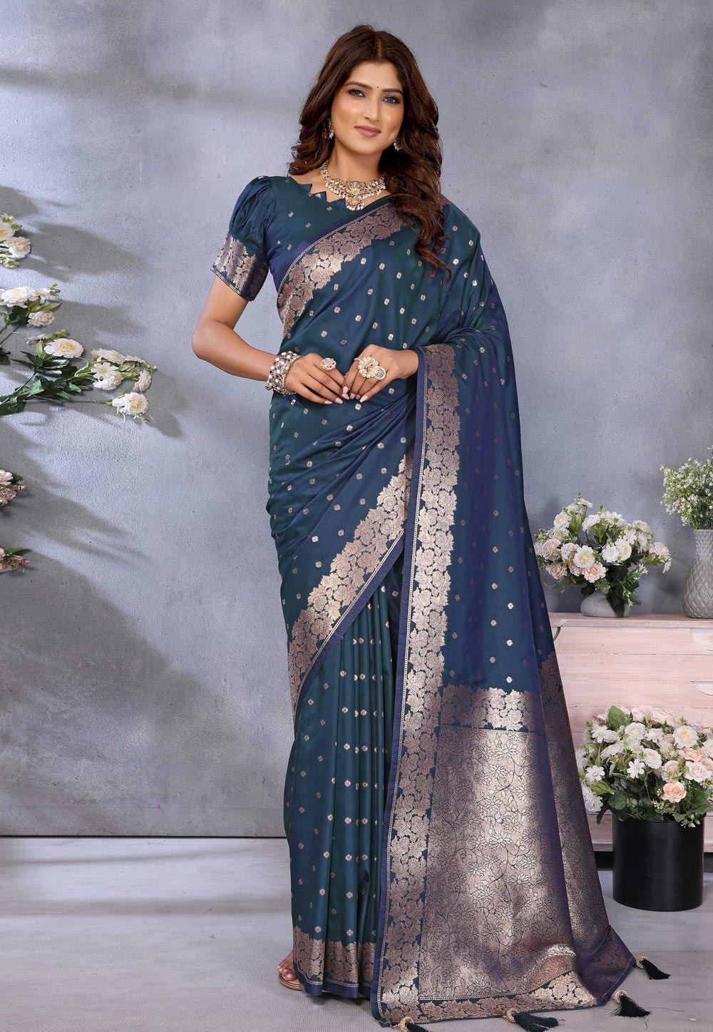 Teal Banarasi Silk Saree With Blouse