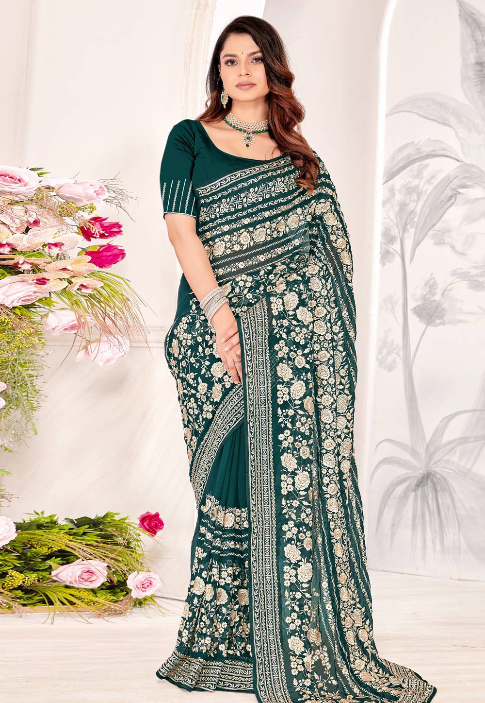 Teal Georgette Saree With Blouse